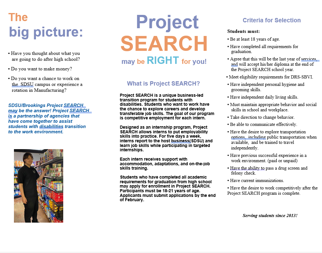 Project SEARCH is an innovative internship program for students aged 18–21 with disabilities who are ready to explore career opportunities and build valuable, transferable skills. In partnership with SDSU, this program provides a unique combination of classroom instruction and hands-on work experience.